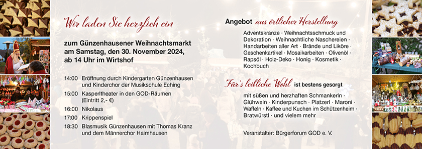 Wir freuen uns sehr, dass wir dieses Jahr nach langer corona-bedingter Pause endlich wieder einen Weihnachtsmarkt in Günzenhausen veranstalten können!